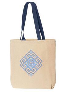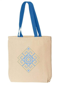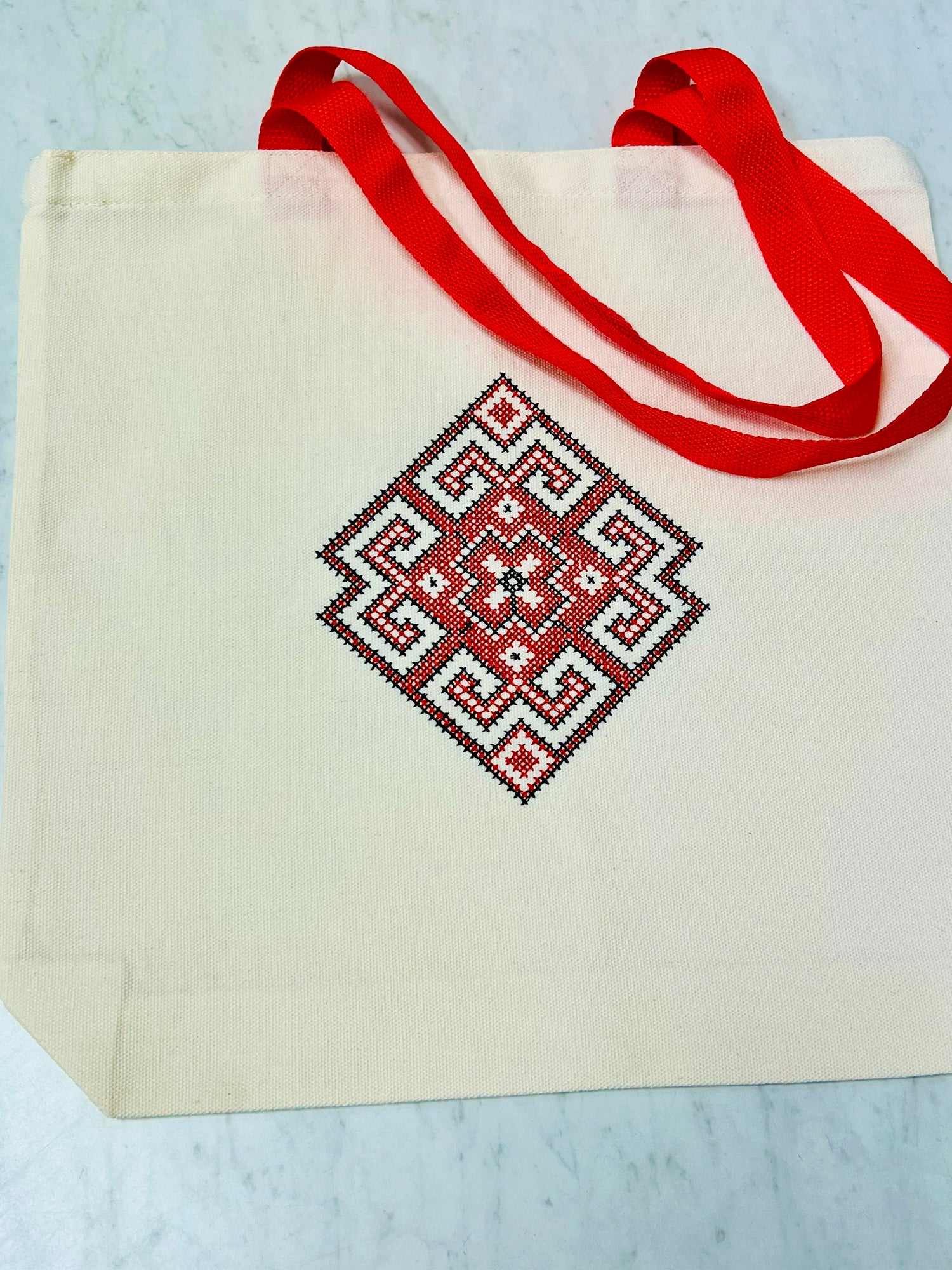 A simple open-top cotton tote bag with real cross-stitch embroidery. A simple and practical household necessity, especially in the summertime.  22" shoulder straps, self-fabric handles.