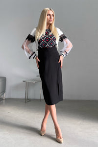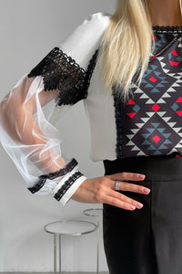 Elevate your style with our Lady's blouse "Rhombus." Featuring delicate lace and mesh sleeves, this blouse adds a touch of elegance to any outfit. Perfect for any occasion, this versatile piece of Ukrainian fashion will add a feminine and chic touch to your wardrobe.