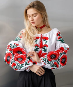 Experience the sophisticated beauty of Ukrainian culture with this stunning embroidered blouse. The intricate red poppy embroidery on this cotton blouse is a striking representation of traditional vyshyvanka. Elevate your style and make a statement with this unique piece of ethnic fashion.