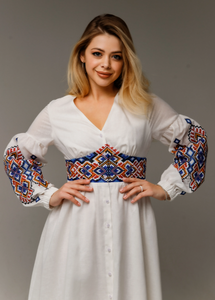 Enjoy the vibrant charm and comfort of our "Marta" dress, beautifully adorned with colorful Ukrainian embroidery. Made from linen blend material, this dress suits any occasion and brings a graceful cultural touch to your wardrobe.