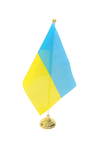 Blue and yellow flag of Ukraine with a pole and plastic table prop.