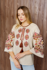 Embrace the timeless beauty of Ukrainian heritage with the "Slava" embroidered blouse, a modern interpretation of the classic Vyshyvanka. Crafted from an ecological linen-nettle fabric, this blouse combines comfort with style, making it an ideal choice for daily wear. The intricate red and gold satin embroidery adds a delicate yet striking detail that enhances your look with subtle sophistication. Perfect for those who appreciate graceful design and cultural authenticity, this blouse elevates your wardrobe with effortless elegance and confidence.