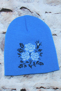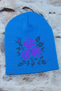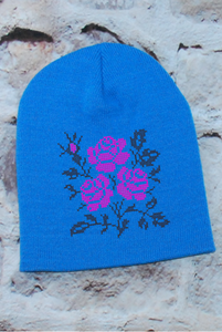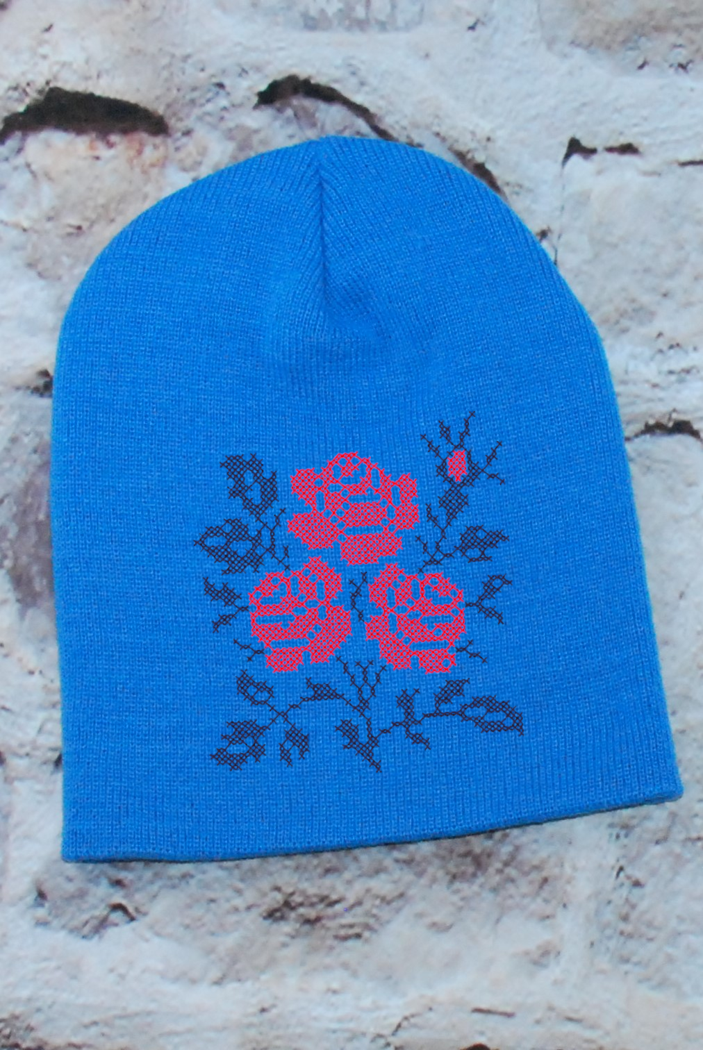 Basic 2-layer knitted beanie hat with real cross-stitch embroidery of traditional Ukrainian design.