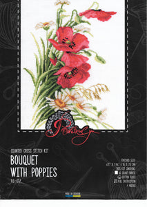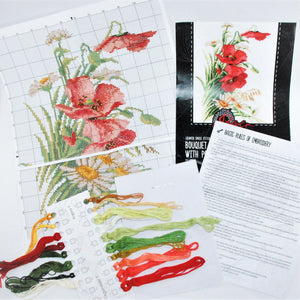 The kit includes the necessary materials to complete the pattern: cotton count fabric, needle, colored embroidery threads, instructional map with a color-coded pattern.