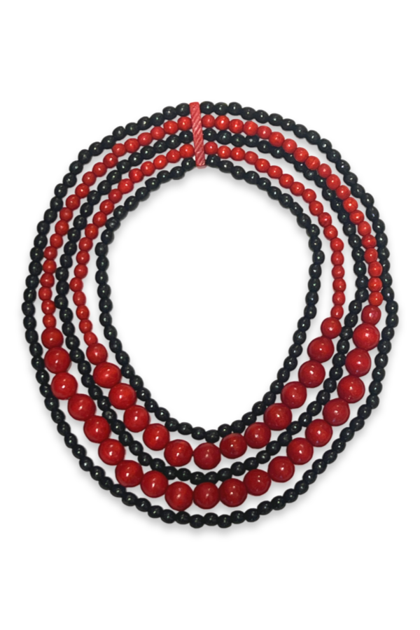 Wooden beads are fixed on elastic bands - easy to put on and off. Lightweight and natural, full of character and folklore feel. The longest strand is 13.5 inches deep.