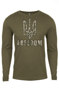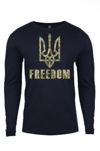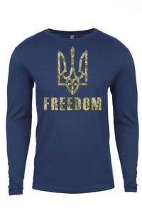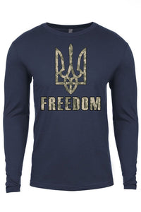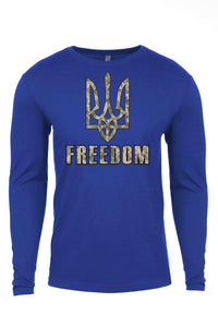 Stylish and contemporary shirt with HTV print of Ukrainian Trident in patriotic blue and yellow colors.