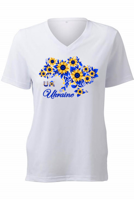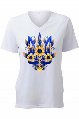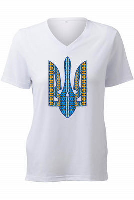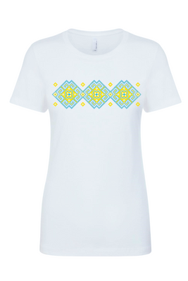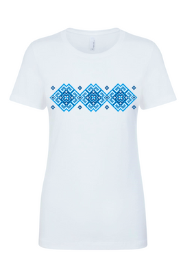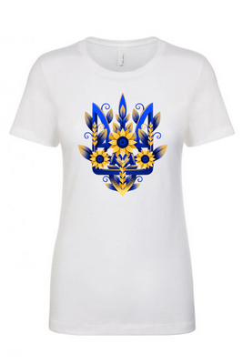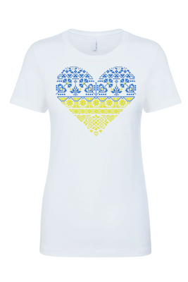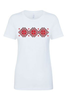 Ladies' t-shirts adorned with traditional Ukrainian designs applied in different decoration techniques: embroidery, digital print, htv including glitter and metallic transfers. Embrace the beauty and heritage of Ukraine with our unique selection of high-quality t-shirts. Showcase your national pride and support for Ukraine at this difficult time of war waged again by #terroristrussia.